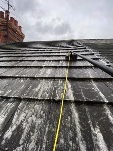 Using high reach scaffolding where necessary, the roof is cleaned with specialist equipment. It is then treated with environmentally sympathetic chemicals to keep your roof looking better for longer. The effect of the chemicals takes a few weeks to give the best results. The gutters are also cleaned as part of the process.